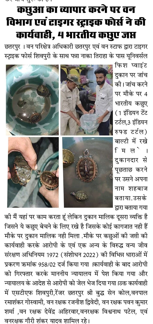 कछुआ का व्यापार करने पर वन विभाग एवं टाइगर स्ट्राइक फोर्स ने की कार्यवाही, 4 भारतीय कछुए जप्त