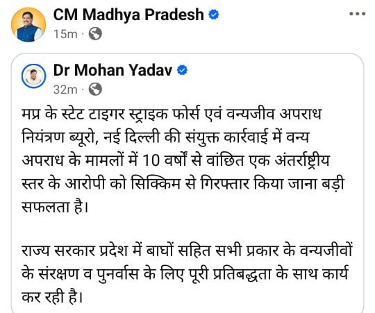 मप्र के स्टेट टाइगर स्ट्राइक फोर्स एवं वन्यजीव अपराध नियंत्रण ब्यूरो, नई दिल्ली की संयुक्त कार्रवाई में वन्य अपराध के मामलों में 10 वर्षों से वांछित एक अंतर्राष्ट्रीय स्तर के आरोपी को सिक्किम से गिरफ्तार किया जाना बड़ी सफलता है। - CM MADHYAPRADESH