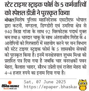 स्टेट टाइगर स्ट्राइक फोर्स के 5 कर्मचारियों को स्पेशल डीजी ने पुरस्कृत किया